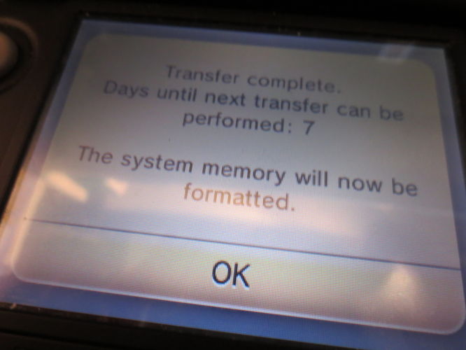 Follow the on-screen instructions. When the console's connected to the internet, and done a bit of faffing, you'll see the screen below. It's now safe to turn off your new 3DS, and transfer data to the microSD card using your PC.
