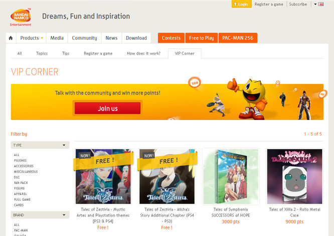 In order to get started, head over to http://bnent.eu/TOZDLC, which will forward you on to the Tales of specific area of the rewards catalogue. You should see both the Tales of Zestiria "Mystic Artes and Playstation Themes" and "Alisha's Story Additional Chapter" at the top of the list - and indeed clicking on them will take you to the buy page - but it's probably easier if you login, via the tiny yellow button at the top right of the screen first. Should you not already have an account, you can create one, also via the login button, but this time clicking on the 'Create new Account' button towards the bottom of the subsequent page. Much like the now defunct Club Nintendo, each Bandai Namco game you buy comes with a unique code which earns you a number of points, which you can then exchange for cuddly Mr Drippys, art books and exclusive costumes (and a Tales of Symphonia comic book we're GUTTED we missed out on). So make sure you register your Tales of Zestiria game with them (the code can be found on the back of the extra slip of paper that came with your game's instruction manual) at some point to start earning!