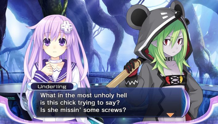 The game's female protagonists are sometimes shown in potentially provocative situations, such as being able to see up their skirts during victory poses, or shown, partially covered with towels in a spa scene, with backsides and cleavage on show. Dialogue is often littered with innuendo and sexual references, in particular a robotic boss who seems to enjoy licking some of the party - "Mmmm the height of ecstasy, licking a nubile maiden's wounds!". Discussions about breast size also pop up fairly frequently too - and while most of what goes on is relatively harmless silliness, it's probably worth noting that Hyperdimension isn't as clean as it's bright, cute and colourful exterior may lead you to believe.