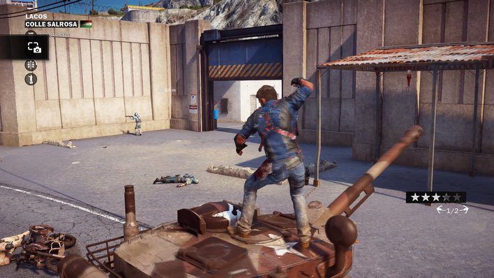 Just Cause 3 is a game all about blowing stuff up and causing chaos - and so, as you'd probably expect, there's a lot of killing, and a lot of shooting to be done. Enemies give off clouds of red blood when shot, and you can use a variety of weapons, from sniper rifles and machine guns to rocket launchers and tanks to do the killing. Some of the more inventive ways to cause chaos involve using your grappling hook, whether you're tethering a soldier to a gas cylinder, before shooting a few bullets into the bottom of it to make a makeshift rocket, and sending the soldier flying into space, or simply attaching a few troops to a giant gas tank before blowing it up.