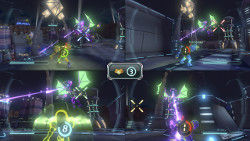 A co-operative 'team attraction' that lets five players dress up as Pikmin star, Captain Olimar or one of a collection of large, differently-coloured Pikmin, it's up to you and your friends to fight through each of the wildlife filled levels to reach the spaceship at the end. The person playing as Olimar takes on a commanding role here, using the Wii U GamePad to send a swarm of mini-Pikmin soldiers into battle, chucking them at enemies to attack them, and also comes armed with a whistle, which he can use to call the player-controlled Pikmin to him, before chucking them at the enemies. Meanwhile, the four other players control their Pikmin with Wii Remotes, running around bashing bad guys, and collecting the nectar they drop to increase their abilities, making them more powerful.