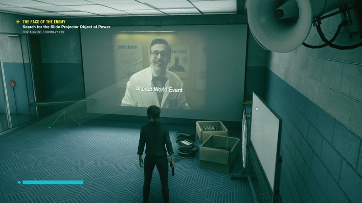 Though the story itself may take a while to get going, though, there are still plenty of scene-setting extras you can find that help shine a light on life inside the bureau. From reports about encounters with "Objects of Power", to fact files about other Altered World Events, along with passive-aggressive notes left from one worker to another, the files you find scattered about the place do a great job of building up an atmosphere of mystery, and slowly help you piece together just what it was that happened in Ordinary. Similarly, the informational videos that play around the place, featuring live actors and recorded by chief scientist Dr. Darling (who, mysteriously enough, is played by the same guy who played Alan Wake in, er, Alan Wake), are a really nice touch, and one that helps bring the world to life.